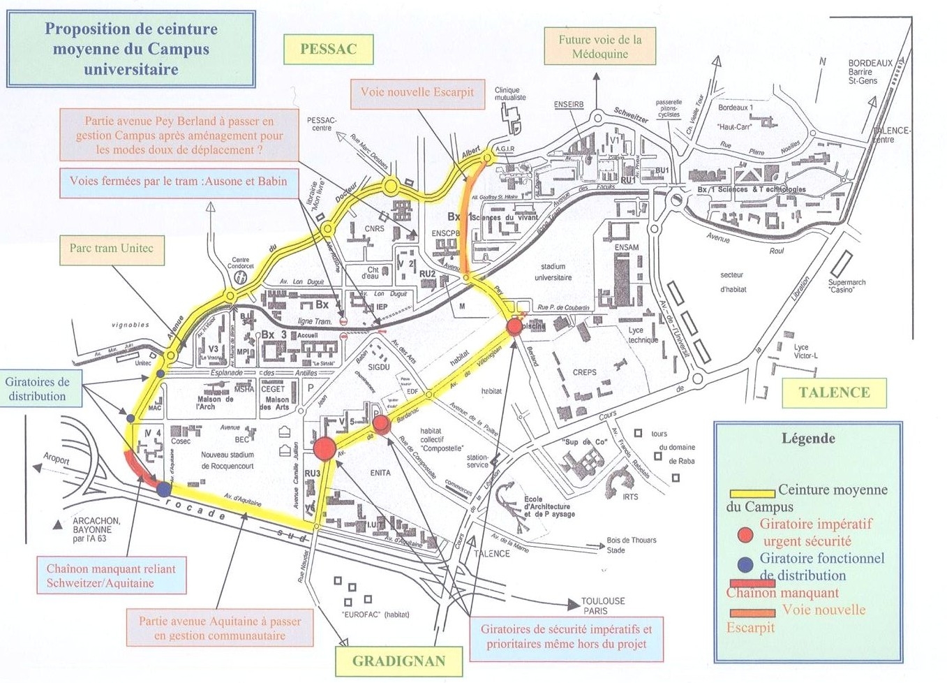 En utilisant pratiquement que des réseaux existants et en évitant une pénétrante nouvelle (de type Antilles / Compostelle devenant un véritable nouvel accès à la rocade – par ailleurs refusé – générateur d’un important trafic de transit constituant une nouvelle coupure préjudiciable à la préservation de la sécurité et de l’entité paysagère du Campus!) dans le cadre d’un aménagement intercommunal intégrant les problématiques des quartiers et du Campus :