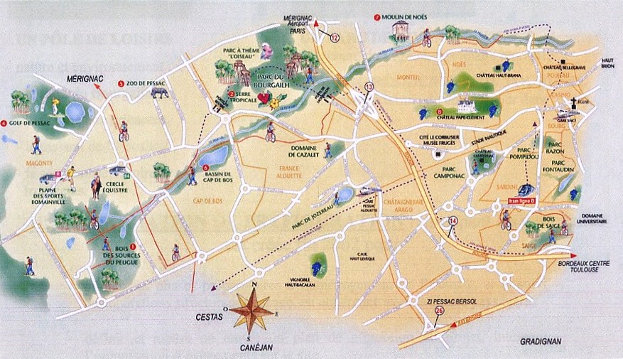 1. La coulée verte de la vallée du Peugue L’Écosite du Bourgailh fait partie de l’ensemble environnemental de la coulée verte de vallée du Peugue comprenant également les cheminements des bords du Peugue, le bassin de Cap de Bos et le Bois des sources du Peugue. À terme, il sera possible de se rendre sans discontinuité du Bois du Bourgailh au Bois des sources du Peugue en empruntant les pistes de cheminement doux réservées aux piétons et aux cyclistes. Dans un avenir plus lointain, en poursuivant vers l’ouest, les plus courageux pourront atteindre à vélo le Bassin d’Arcachon, au Domaine de Certes. |